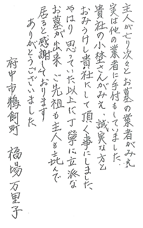 何も墓のことが解らず困っていた時、電話帳を見て出会えたのがいしよしさんでした。墓の方向、日付、すべて、上田店長にお世話になり、心より安心してお任せ出来ました。上田店長に出会えて良かったと思います。有難う御座いました。 -
